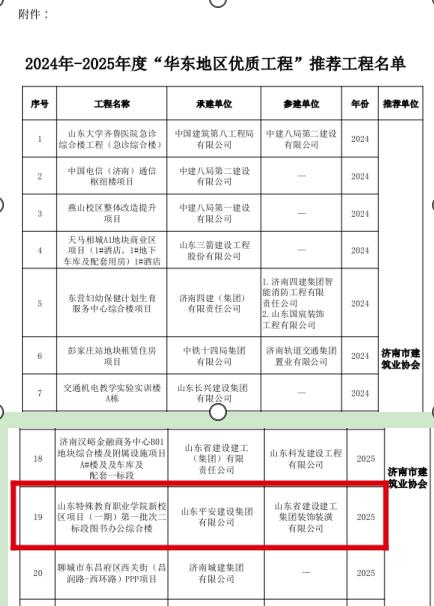 近日,山东省建筑业协会公布2024-2025年度山东省“华东地区优质工程奖”推荐工程名单,学院新校区图书办公综合楼工程荣获“华东地区优质工程”奖。
