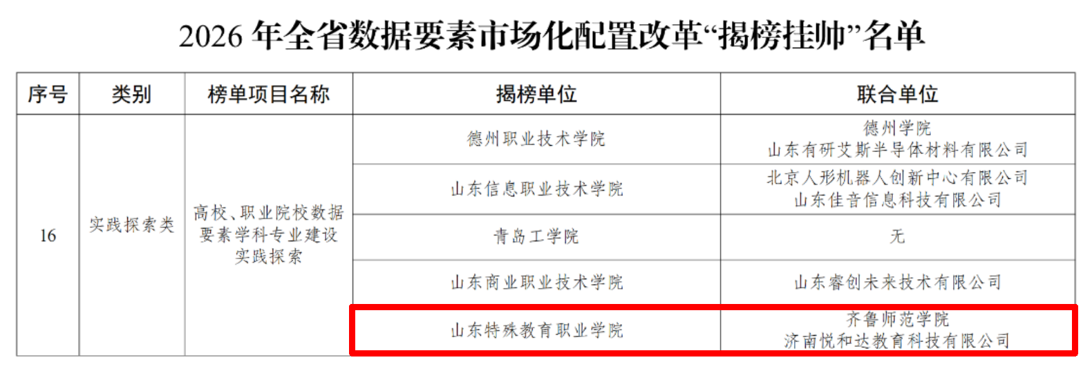 近日,山东省大数据局正式发布2026年全省数据要素市场化配置改革“揭榜挂帅”榜单,学院联合齐鲁师范学院人工智能教育研究院、济南悦和达教育科技有限公司共同申报的“高校、职业院校数据要素学科专业建设实践探索”项目成功入选。