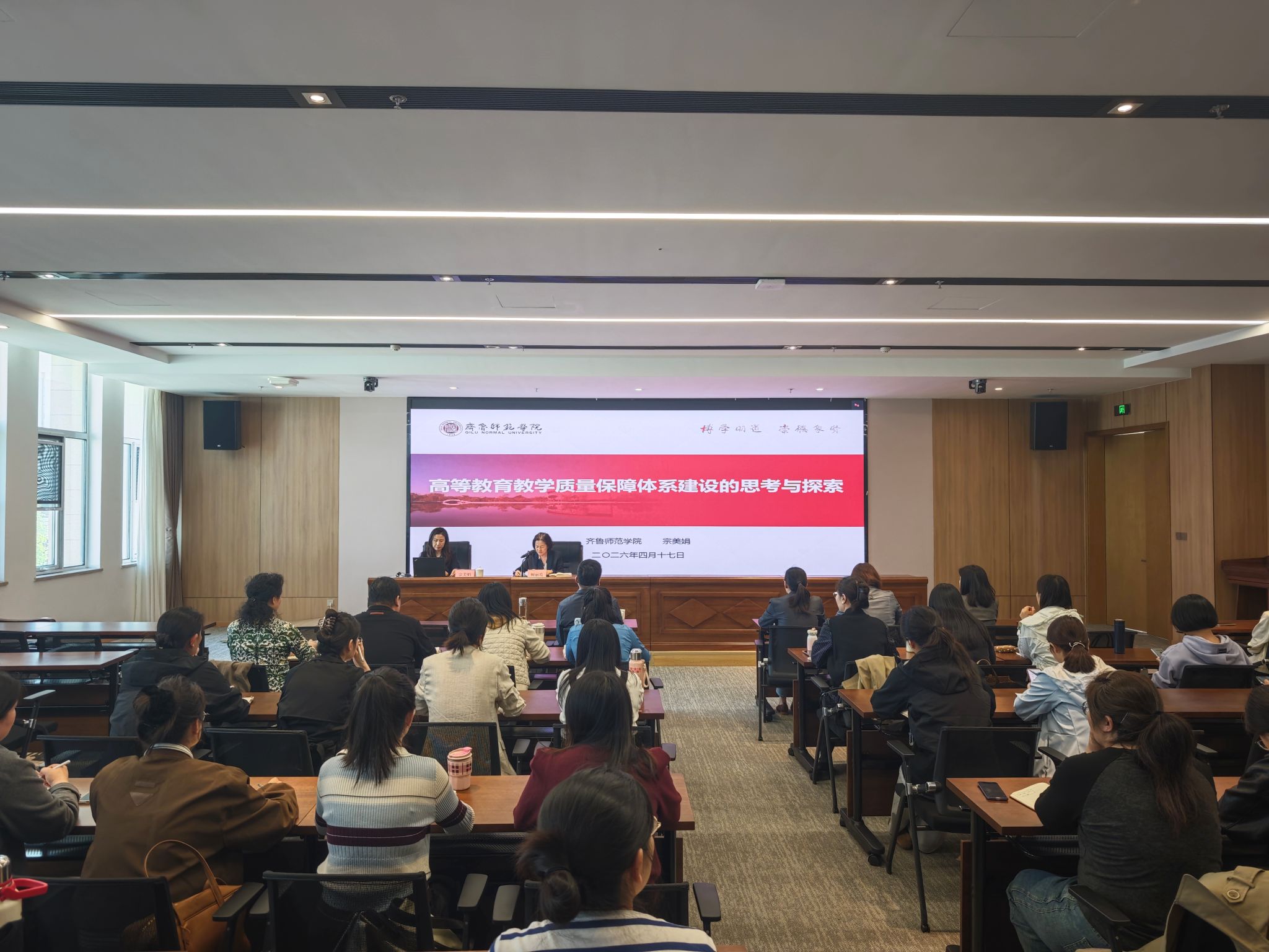 为进一步提升学院教学质量管理水平,完善教学质量监控体系,4月17日下午,学院在创培中心会议室组织召开2026年度教学质量提升专题培训会。会议特邀齐鲁师范学院二级教授宗美娟作专题报告,学院党委书记杨磊出席会议并讲话,培训会由副院长顾丽霞主持。