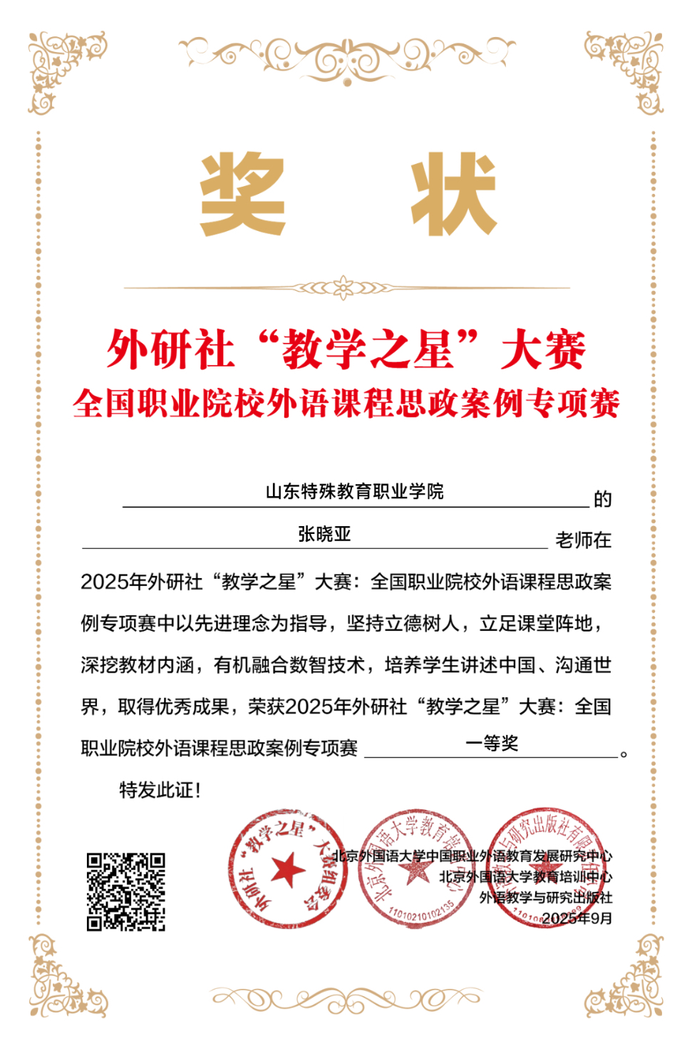 近日,2025年外研社“教学之星”大赛全国职业院校外语课程思政案例专项赛获奖名单公布。kaiyun开云官方在线入口公共教学部张晓亚教师凭借出色的课程思政教学案例,在全国众多参赛教师中脱颖而出,荣获全国一等奖。