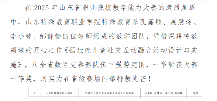 特殊教育系展慧玲、孔嘉颖、郝静静、李小婷团队在2025年山东省职业院校教学能力大赛中力克群雄,斩获全省一等奖,实现历史性突破。