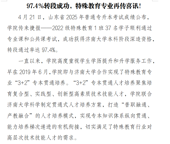 2025年4月,专升本考试传来捷报:2022级特殊教育专业37名学生通过转段考试,转段成功率达97.4%;43名报考本科院校的学生中26人成功录取,录取率达60%,两项数据均创历史新高。