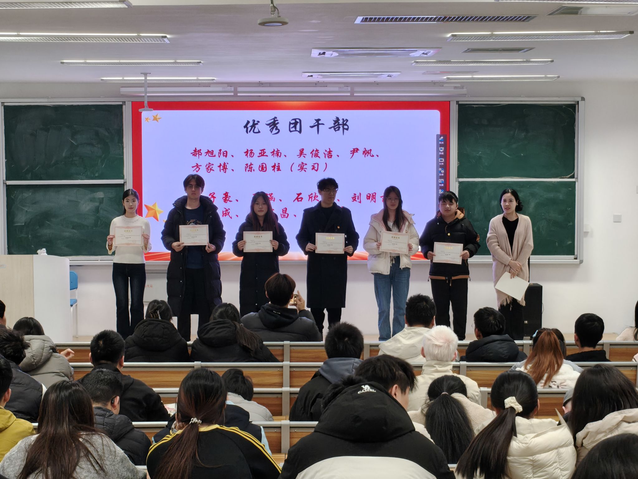 随后,张梦瑶老师宣读《关于表彰2025年度优秀团干部、优秀团员的决定》,明确表彰标准与示范意义,号召全体团员以先进为标杆,在学习实践中锤炼过硬本领。颁奖环节有序推进,系团总支副书记王钟毓为 “优秀团员” 荣誉获得者颁发证书,张梦瑶老师为 “优秀团干部” 颁奖。受表彰同学纷纷表示,将珍惜荣誉、戒骄戒躁,持续发挥模范带头作用,以实际行动践行团员使命。