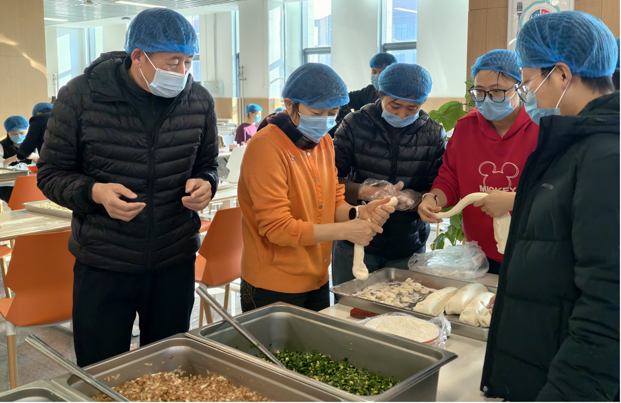 活动现场暖意融融,食堂已备好各类食材工具。教职工们自发分组协作,和面、擀皮、包馅各司其职。经验丰富的教师热心指导新手,从面团处理到捏褶技巧倾囊相授,互动间乐趣十足。尽管新手包的饺子形态各异,但都饱含心意。教职工们边忙碌边畅谈工作生活,食堂内满是欢声笑语与温情。经全体人员通力协作,成功包制水饺3000余个。