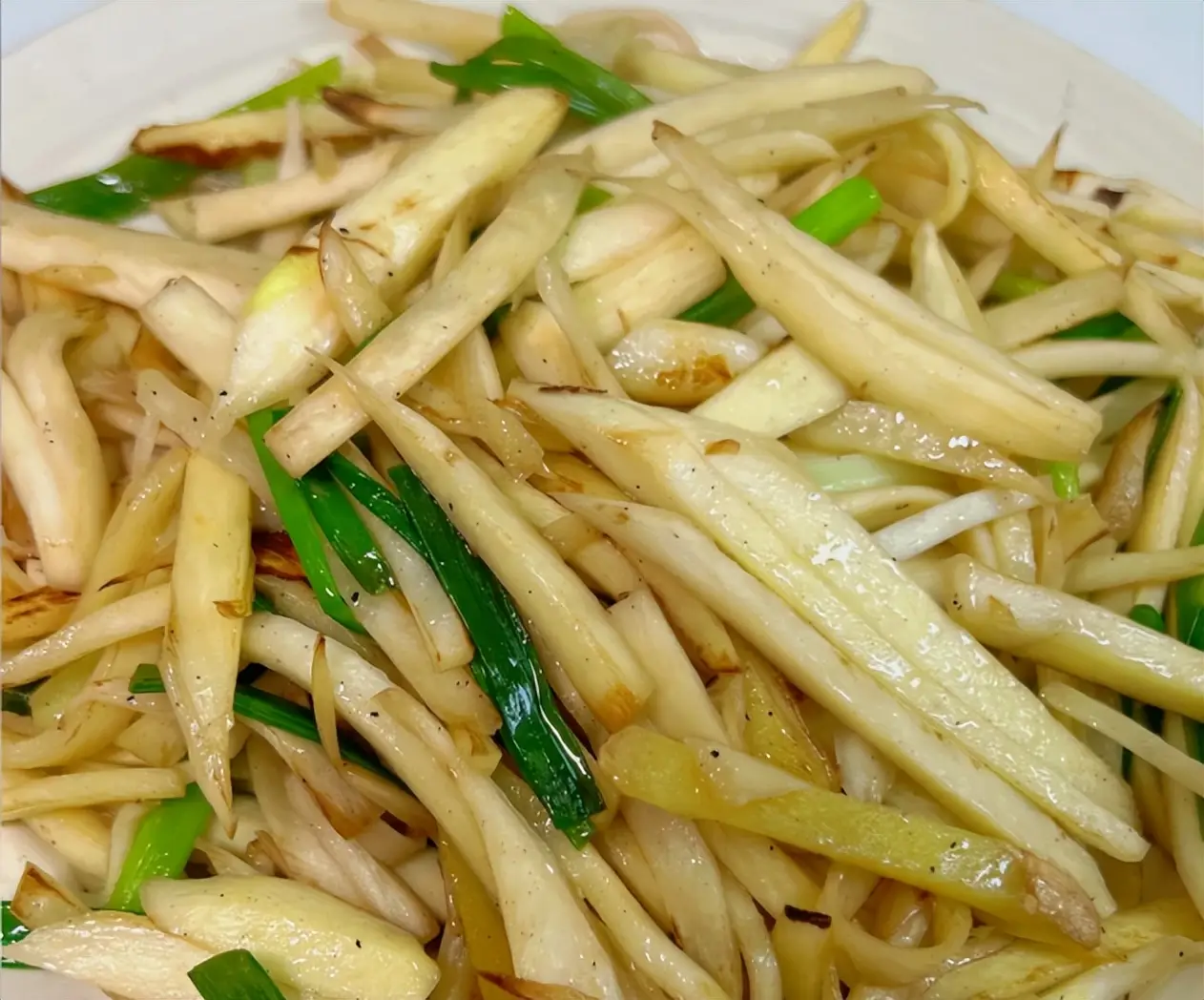 1.准备茭白清洗干净切丝备用,小葱切段。