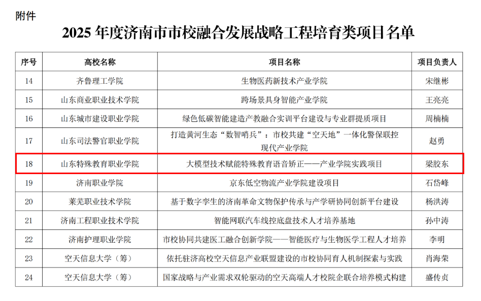 近日,济南市教育局公布了2025年度济南市市校融合发展战略工程培育类项目名单,学院信息技术系申报的“大模型技术赋能特殊教育语音矫正——产业学院实践项目”成功入选。