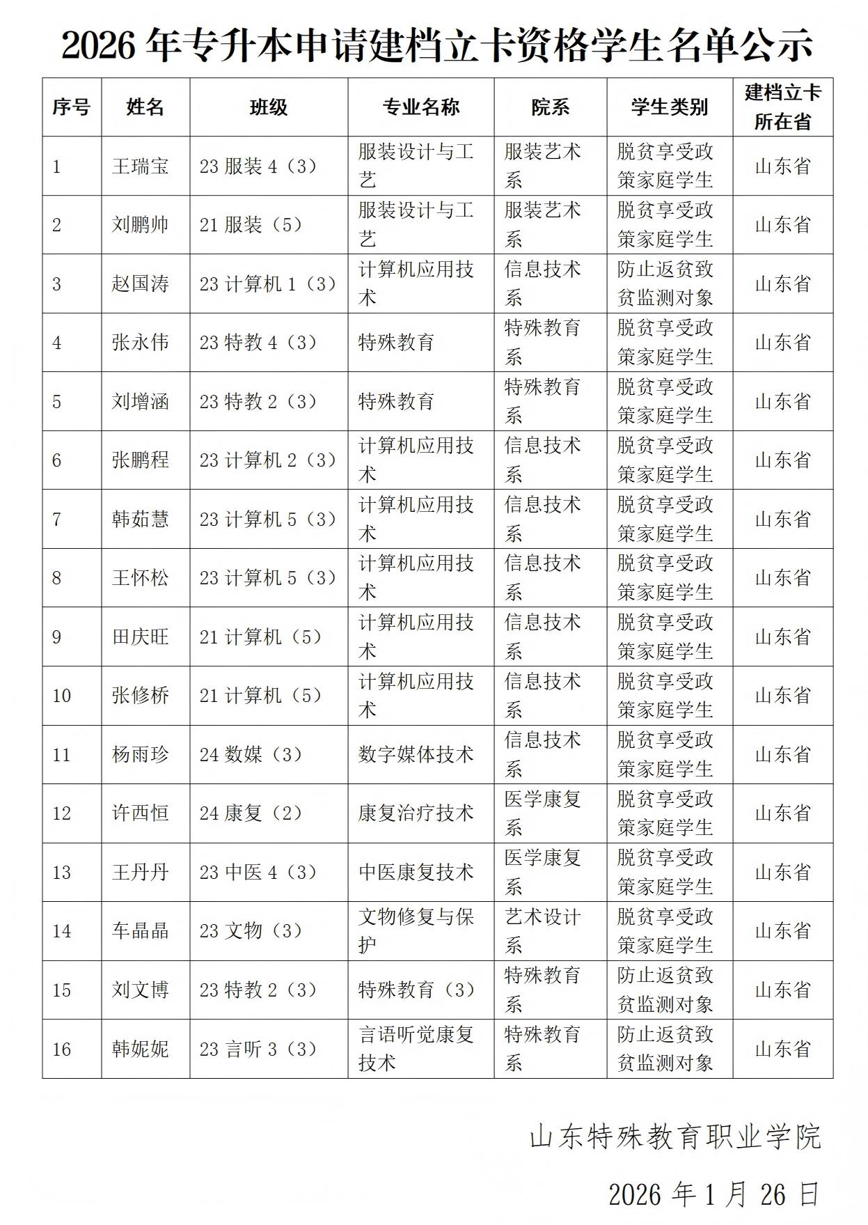 根据山东省教育厅、山东省人民政府征兵办公室、山东省退役军人事务厅《关于做好山东省2026年普通高等教育专科升本科招生考试报名工作的通知》(鲁教学函〔2025〕24号)中关于报送建档立卡家庭考生的条件及要求,kaiyun开云官方在线入口符合建档立卡家庭考生资格申请条件的学生共有16人,现将名单予以公示,公示期为2026年1月26日至1月31日。如有异议,请在公示期内以实名方式书面反馈至继续教育部巩俊成,电话:87198325。
