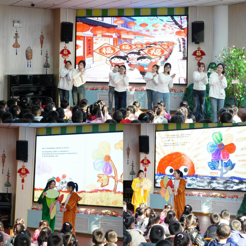 活动现场洋溢着喜庆祥和的节日氛围。志愿者首先为孩子们带来了充满朝气与祝福的舞蹈《桃花朵朵开》和《福气要来到》,欢快的节奏、欢乐的舞步瞬间点燃全场,小朋友们随着音乐拍手律动,笑容灿烂。随后志愿者们化身绘本角色,声情并茂地表演了绘本故事《彩虹色的花》,将故事中关于分享、友谊、爱与奉献的美好品质娓娓道来,在孩子们心中播下了善良与温暖的种子。