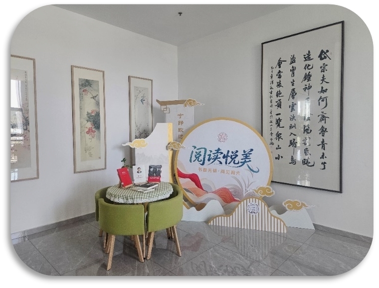 活动期间,师生们群策群力、分工协作,对图书馆办公楼5楼、1-4号教学楼以及文体馆一楼大厅等六个公共区域进行了精心布置。各阅读空间因地制宜、各具特色,原本普通的楼道、角落、大厅,在师生们的巧手装扮下,变身为一个个温馨雅致、充满书香气息的“微型书房”。