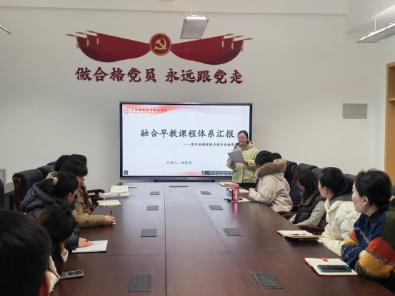 在融合早教课程体系汇报环节,特殊教育系实训中心杨蒙福老师以“用专业课程助力孩子全面发展”为主题,从课程理念、课程设置、课程资源三方面展开阐述。课程秉持“全人发展,适性成长”核心理念,覆盖0-3岁婴幼儿身体、认知、情感、社交、自理五大发展领域,构建了感统欢动、融合艺术、生活技能、社交游戏、科学探索及个别化成长六大课程模块,适配不同年龄段婴幼儿发展需求。同时,课程依托科学的评估体系与丰富的理论资源,确保教学的专业性与针对性,得到了考察团的高度认可。