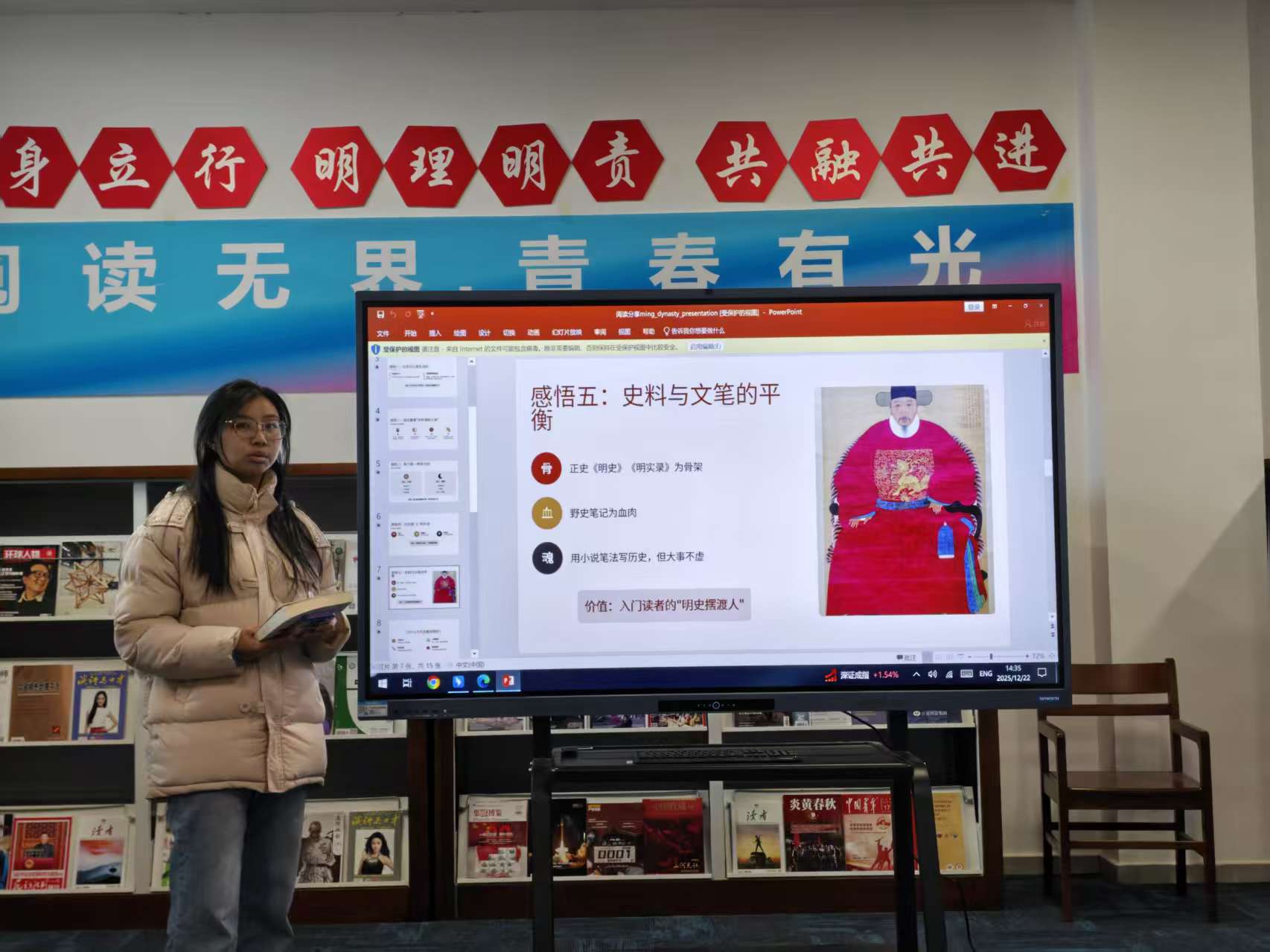 第一位分享者是马静茹同学,她选择了当年明月的《明朝那些事儿》。马静茹以轻松幽默的方式,介绍了这部作品如何以现代视角解读明朝历史,打破传统史书的严肃框架。她重点讲述了明朝几位代表性人物的故事,分析了历史背后的权力逻辑与人性的复杂性,并分享了阅读历史对理解现实、启迪智慧的独特价值。