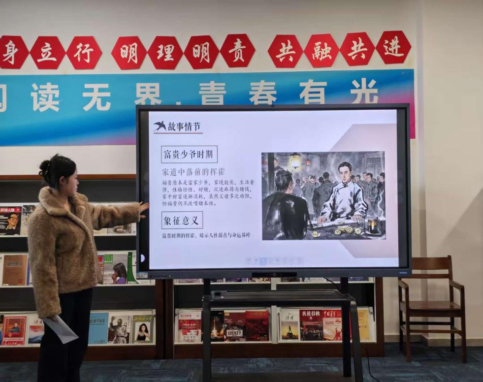紧随其后,李可鑫同学分享了余华的代表作《活着》。她以“生命的韧性”为线索,深入剖析了福贵这一人物在苦难中展现出的顽强生命力。李可鑫结合小说中的经典情节,探讨了苦难与希望、个体命运与时代洪流之间的复杂关系,并引导听众思考生命的意义与价值。她的分享深情而富有哲理,为现场增添了一份深沉而动人的氛围。