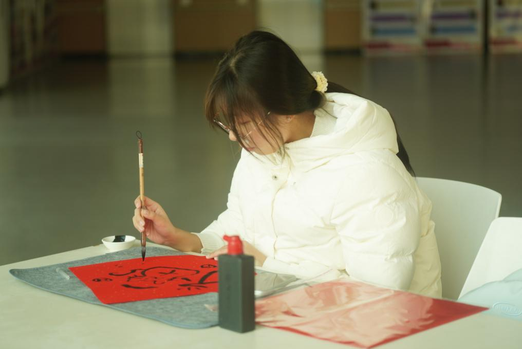 书法体验区内,参与者亲手执笔蘸墨书写福字,一笔一划间感受笔墨流转的韵律,沉浸式体味中华书法艺术的独特韵味与文化内涵。