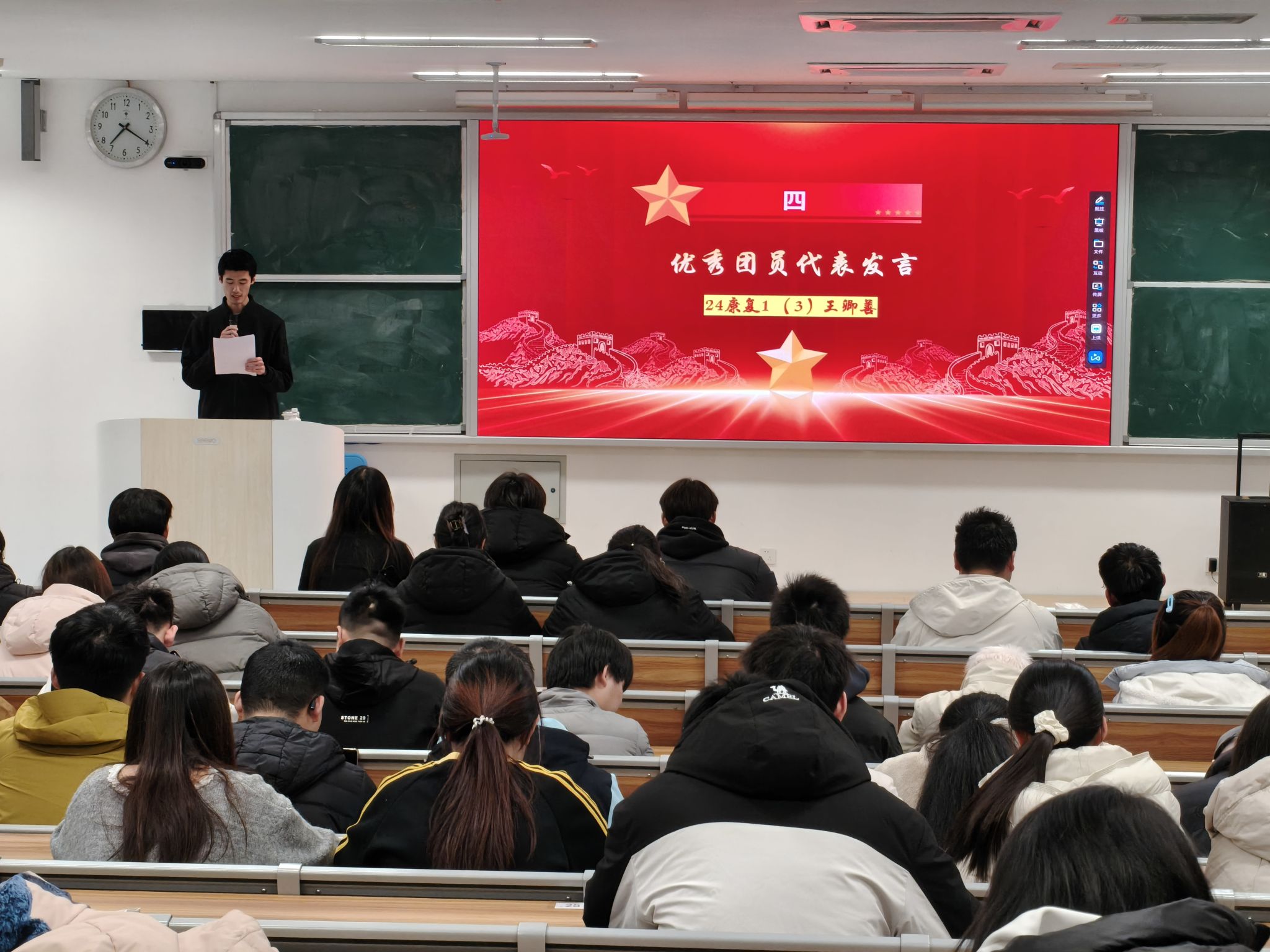 优秀团员代表王卿善同学登台发言,结合自身专业学习与志愿服务经历,分享成长感悟与实践心得,生动展现了当代团员求真务实、积极向上的精神风貌,为在场青年学子提供了可学可鉴的实践范例,引发广泛共鸣。