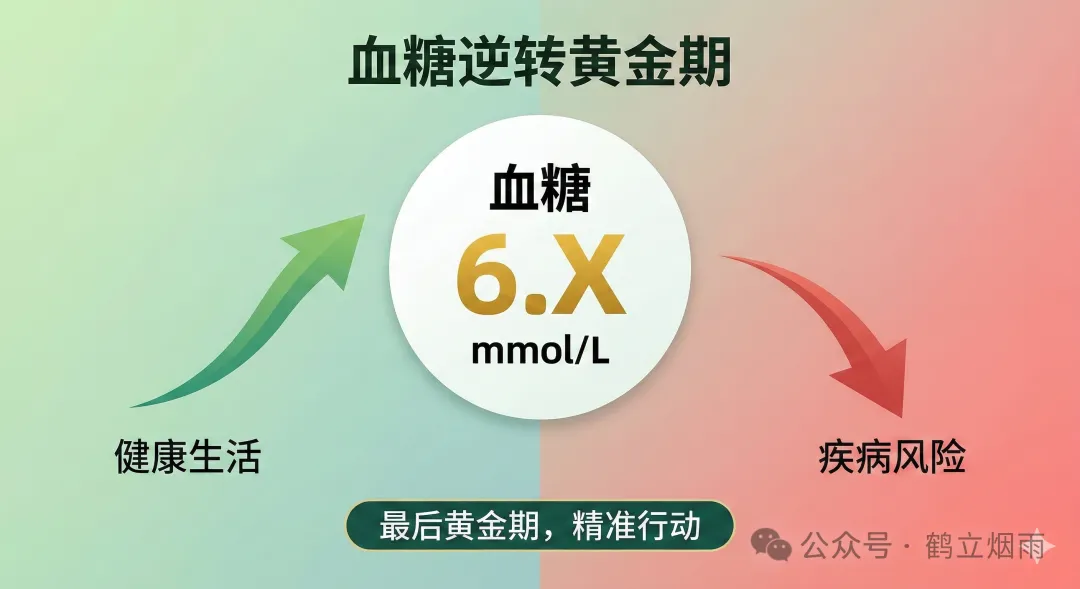 如果你空腹血糖6点几,后面标了一个向上的箭头,不算糖尿病,但也不算正常,往前走,可能几年之内就变成真正的糖尿病;但如果现在就动手,这个阶段是真的可以退回到正常的。